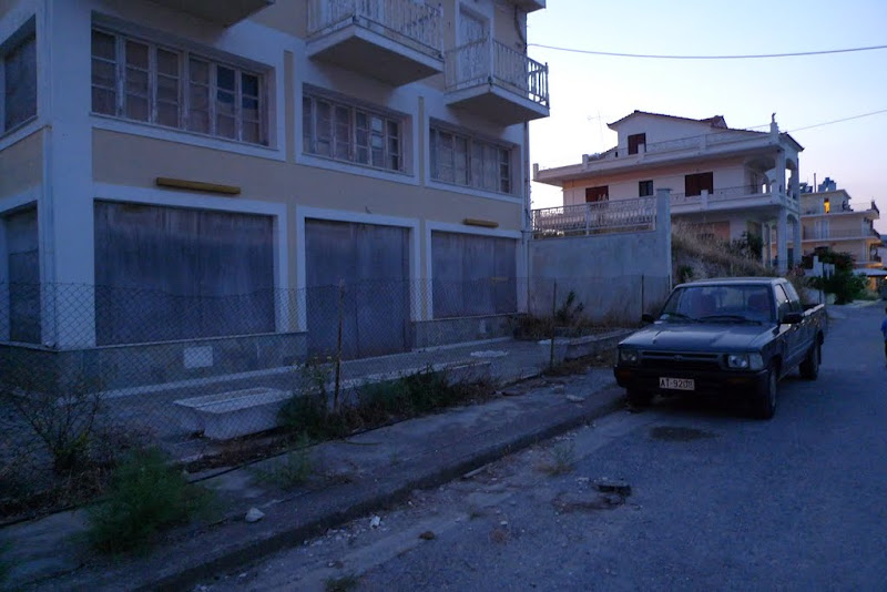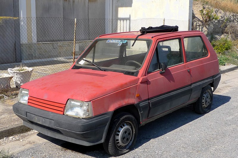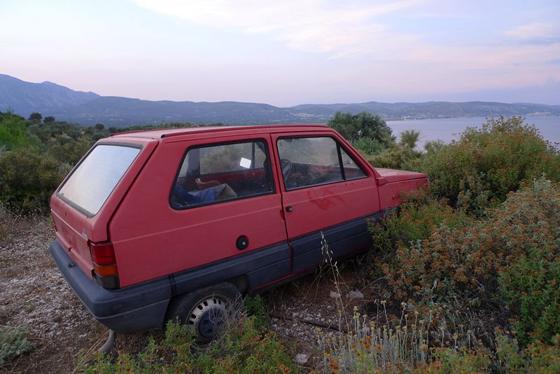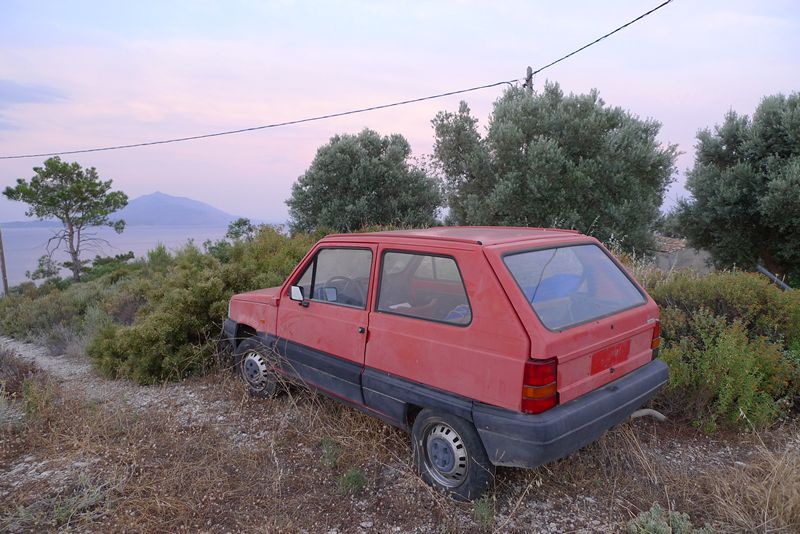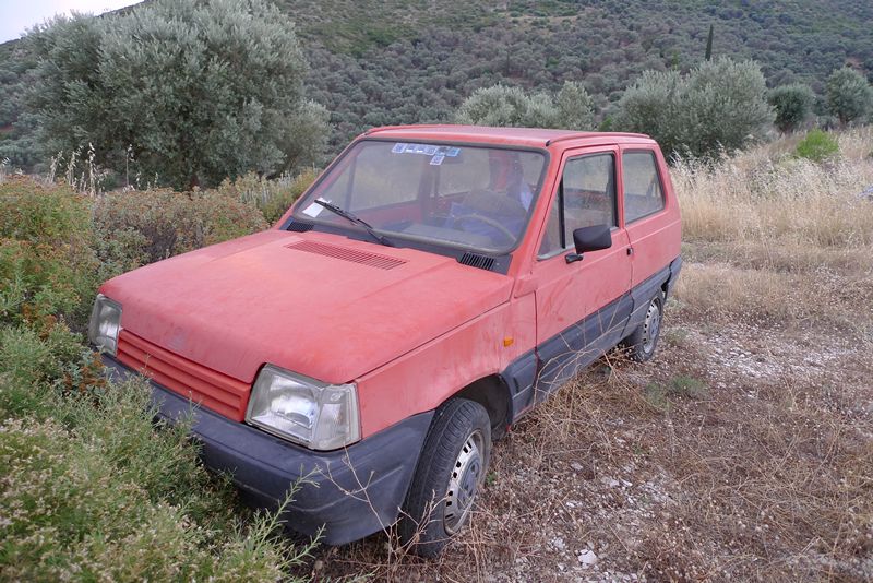… dachte ich mir vor ein paar Tagen kurz vor Ireon, ca. auf Höhe des Papa Beach, nur ein Stockwerk höher, auf einem Olivenhain. Ein altes Fiat Panda Autowrack kam mir irgendwie bekannt vor. Ein Vergleich der Bilder hat nun den Beweis gebracht – die Anordnung der Aufkleber auf der Frontscheibe deuten auf das gleiche Fahrzeug hin. Hier das Bild aus Ireon vom Oktober 2009 mit der dekorativen Schwimmweste: