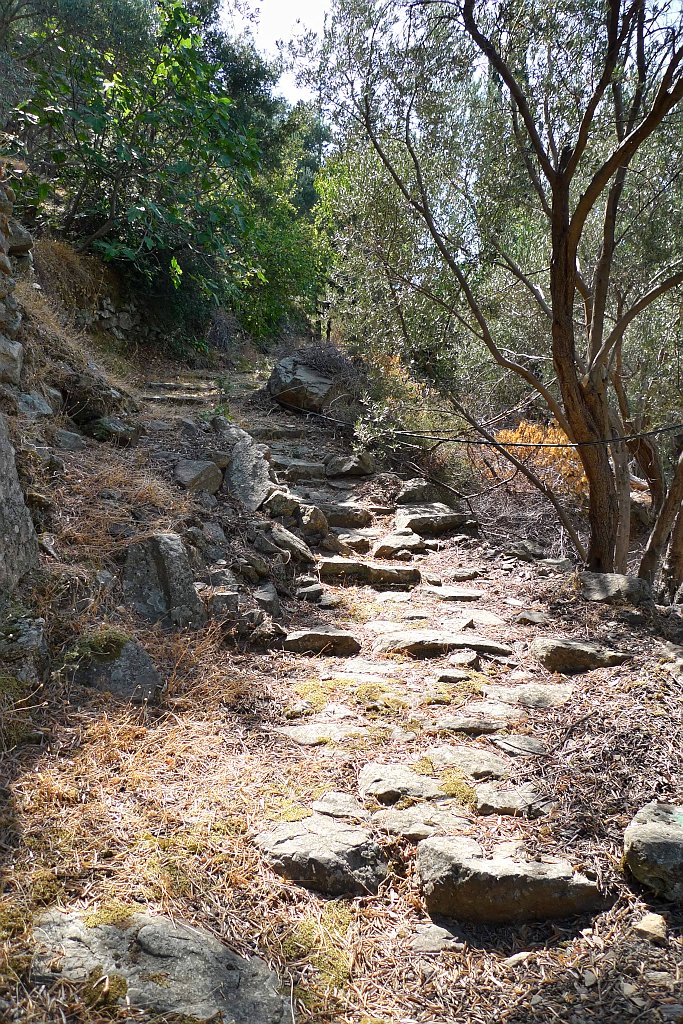 Die Tour 10 nach Ambelos laufen wir schon lange anders, wie ich sie 2008 hier veröffentlicht hatte. Die Strecke über Livadaki gefällt uns viel besser. Dann ist 2010 leider ein großer Feigenbaum in den Weg gefallen und hat ihn an einem steilen Stück mit weggerissen. So mussten wir uns was anderes suchen und haben jedes mal ein wenig mehr erkundet. In 2013 gab es zudem noch jemanden, der mit grünen Punkten eine Alternativroute markiert hatte. Dies, mit unserem alten Weg kombiniert, hat uns nun sehr gefallen, auch wenn die Strecke bis Ambelos recht anstrengend ist.